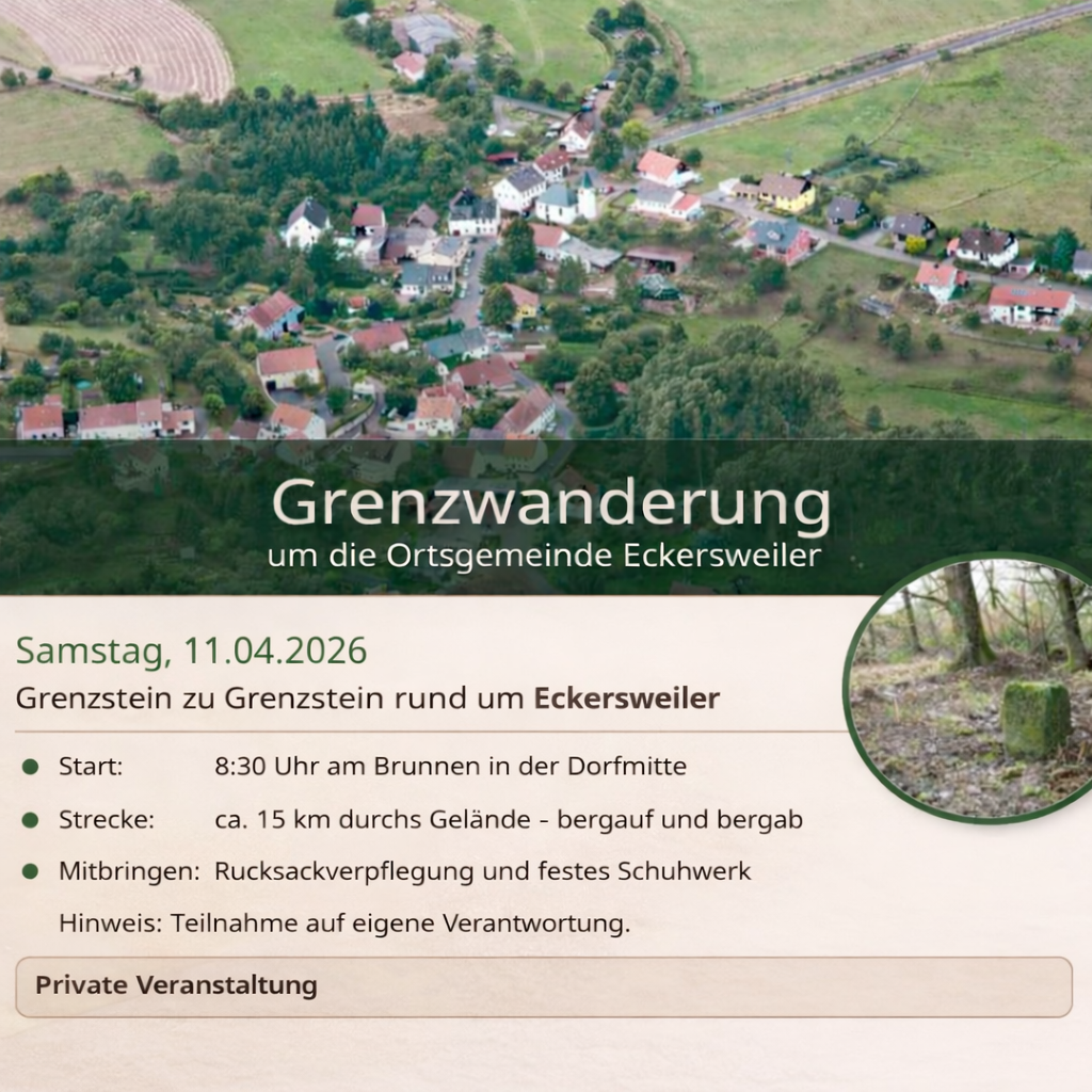 Schön, dass Sie hier sind. Auf unserer Internetseite möchten wir Ihnen Eckersweiler vorstellen und Ihnen einen schnellen, übersichtlichen Zugang zu wichtigen Informationen bieten – von aktuellen Mitteilungen und Terminen über Ansprechpartner bis hin zu Themen rund um das Gemeindeleben. Wir laden Sie ein, sich in Ruhe umzusehen und sich einen ersten Eindruck von unserer kleinen, lebenswerten Gemeinde zu verschaffen.